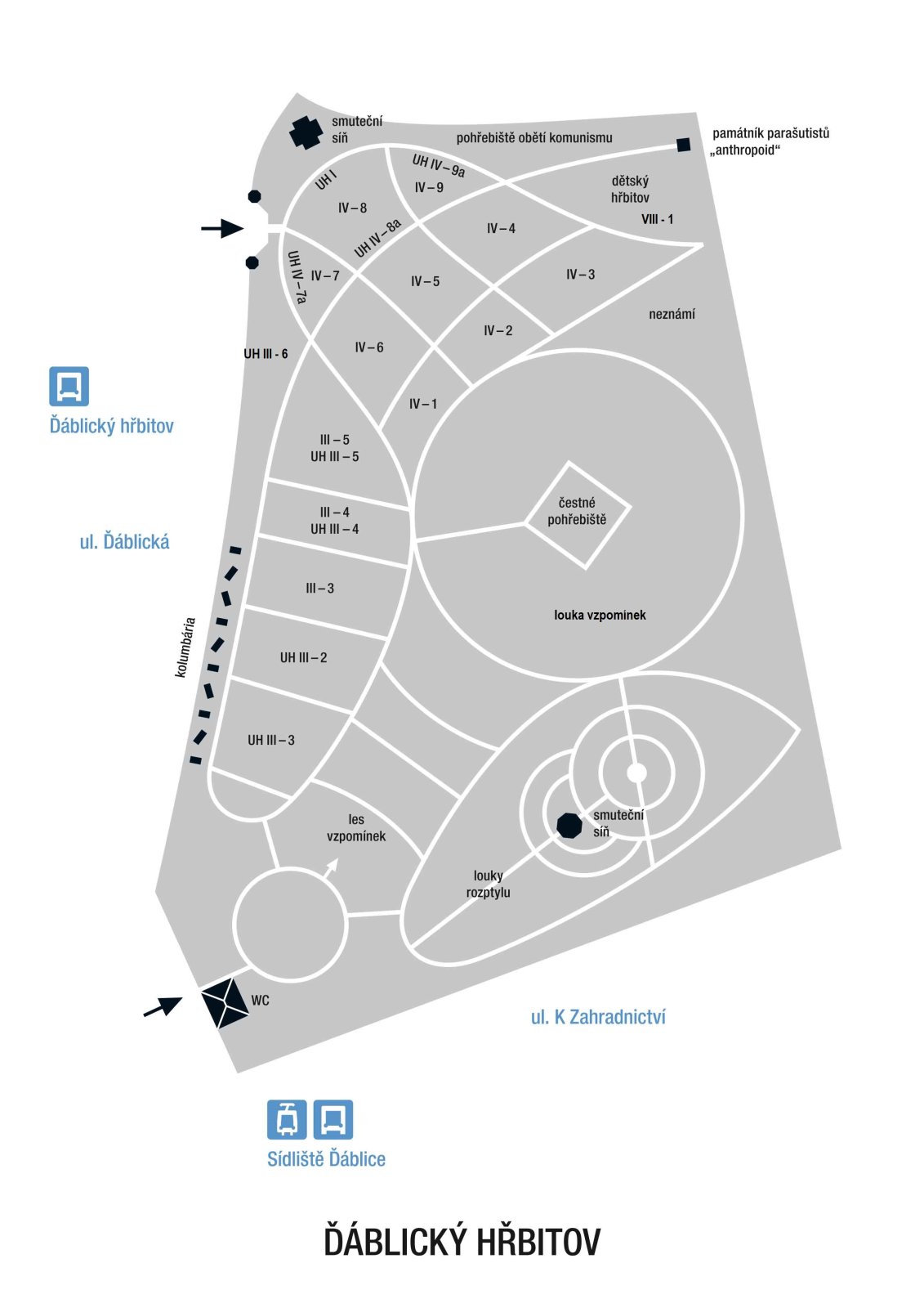 Bohnický hřbitov • Branický hřbitov • Břevnovský hřbitov • Bubenečský hřbitov • Ďáblický hřbitov • Hloubětínský hřbitov • Hlubočepský hřbitov • Holešovický hřbitov • Hostivařský hřbitov • Hrdlořezský hřbitov • Jinonický hřbitov • Kobyliský hřbitov • Košířský hřbitov • Krčský (Nuselský) hřbitov • Libeňský hřbitov • Malostranský hřbitov • Malvazinecký hřbitov • Motolský hřbitov • Olšanské hřbitovy (1) • Olšanské hřbitovy (2) • Podolský hřbitov • Prosecký hřbitov • Radlický hřbitov • Ruzyňský hřbitov • Strašnický hřbitov • Strašnický evangelický hřbitov • Střešovický hřbitov • Šárecký hřbitov • Vinohradský hřbitov • Vokovický hřbitov • Vršovický hřbitov • Vyšehradský hřbitov • Záběhlický hřbitov